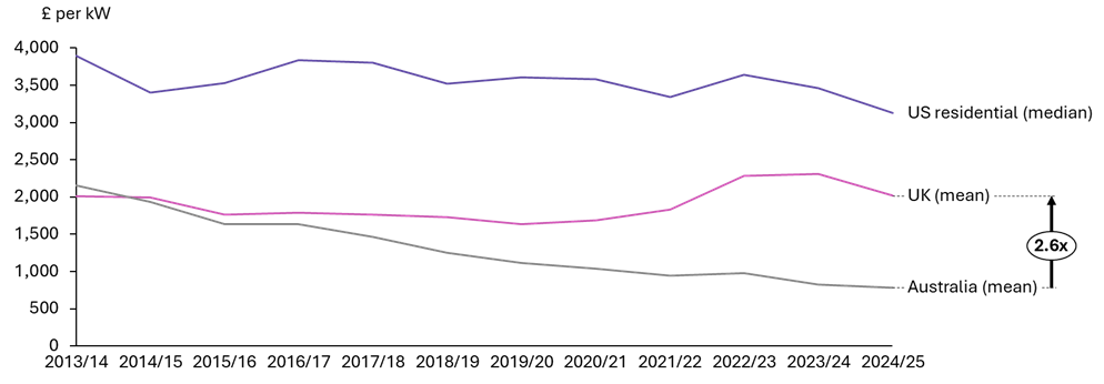 Rooftop solar installation cost per kW by year, UK vs Australia and US (with comparability caveats)