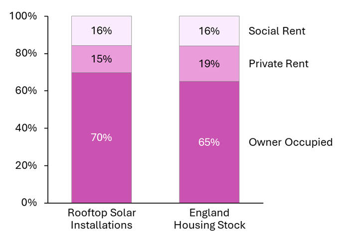 Novel financing mechanisms with landlords could drive further adoption among private renters, particularly in London. Owner-occupied dwellings are unsurprisingly over-represented as they have the power to make upgrades to their home and benefit from energy bill reductions. If I wanted to pitch rooftop solar to my landlord to save money on my energy bill, I could offer them a small share of my bill savings, and they would retain this asset for future tenants. Energy suppliers could offer this explicit split-revenue product to allow both renters and landlords to benefit from cheaper electricity.