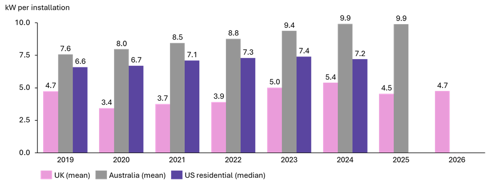Average rooftop solar installation size by year, UK vs Australia and US (with comparability caveats)