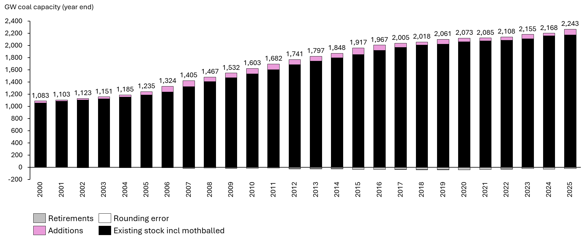 Installed capacity of coal power globally by year, net of annual additions and retirements
