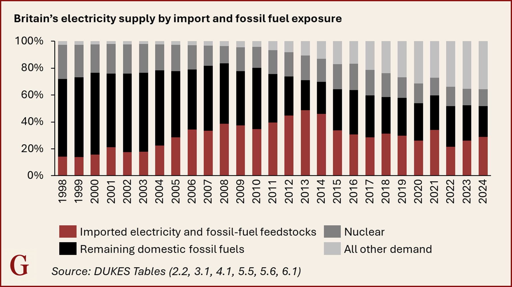 Gas dependency is the primary driver cited for persistently high British energy costs. This is partly because gas is imported and uses an international reference price, and partly because it sets the wholesale market price for all other generation. Although the UK has reduced both its electricity import exposure to 29% (down from 49% in 2013) and fossil fuel use over the past decade, the Energy and Climate Intelligence Unit estimated that gas was setting the wholesale market price 85% of the time in 2024.