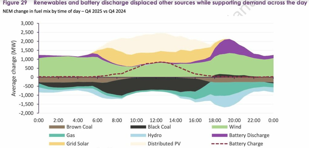 The chart shows how the mix of different technologies changed between Q4 2024 and Q4 2025 for average dispatch across the day. Wind, solar, batteries are up, while coal and gas are down (also hydro, not sure why).