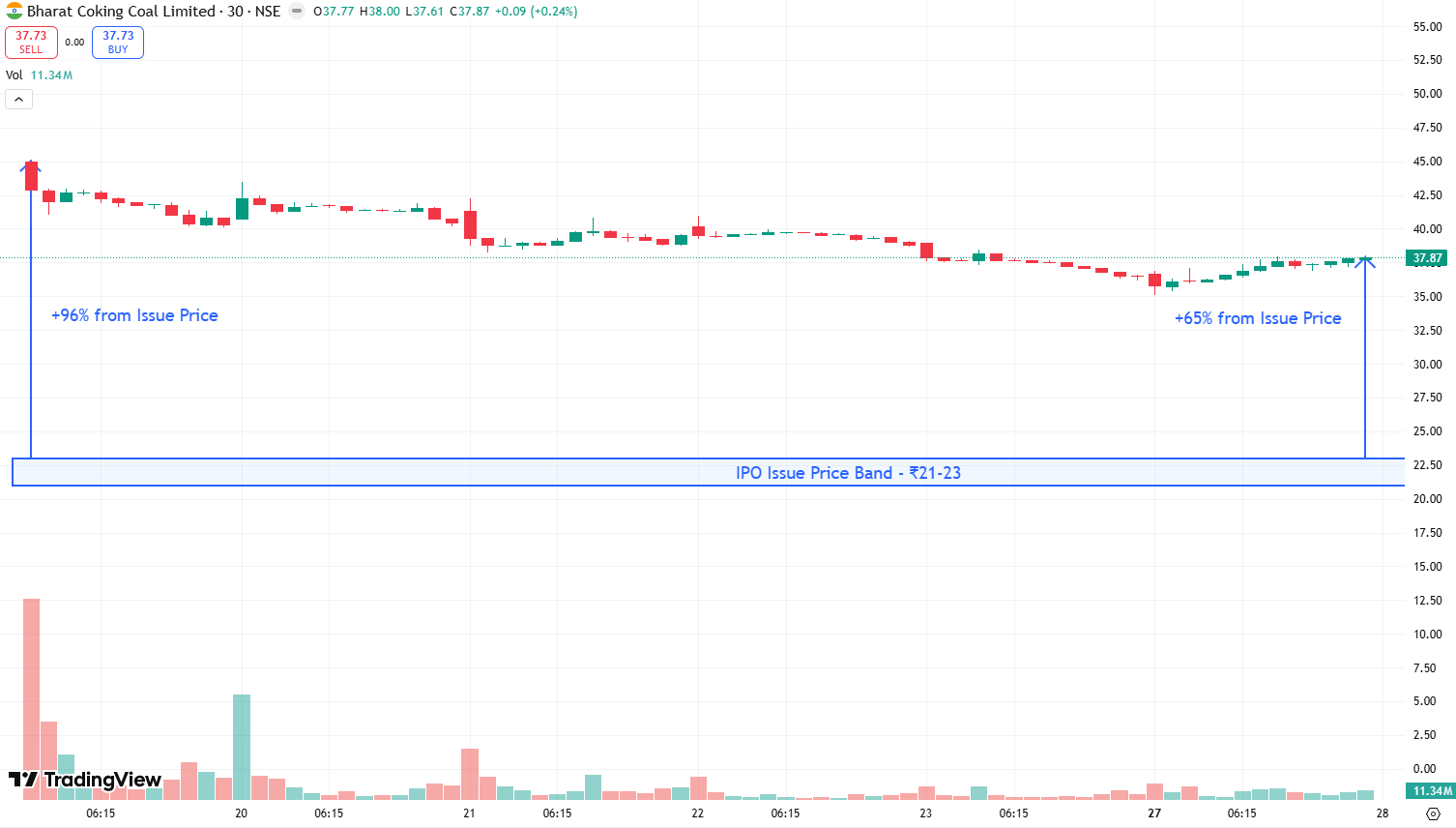 Since the debut, the stock price has fallen to ~₹38 per share, still a 65% premium to issue price.