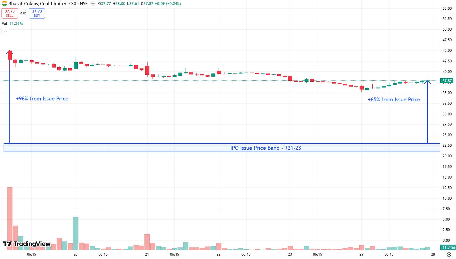 The IPO was way over-subscribed, and the stocks priced at the top of the issuing range, ₹23 per share. This generated $119m (before fees) for the government, and ultimately the people of India.