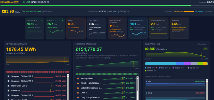 Curtailment is when generators are instructed to switch off because there is too little capacity on the network to deliver their electricity to where it is needed. This partly happens because Britain has not expanded its grid infrastructure sufficiently to connect its generating sites to its demand centres, and partly because the power market in the UK does not incorporate any constraints by location. At the time of writing this paragraph, Kilowatts IO estimated that over 1,700 MWh of production had been curtailed in the past 25 minutes. This alone represented £120,000 of payments to plants that switched off. If any of these sites had a CfD above the prevailing price of £71 per MWh, they would be paid even more.