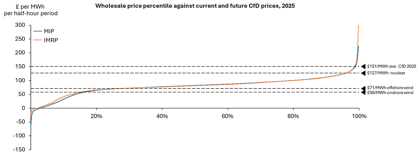 CfD contracts mean reducing gas on the grid may not be sufficient to bring down prices. Generators with a CfD are incentivised to bid wholesale prices close to zero because they are paid a fixed price regardless. The traded wholesale price may be lower, but the all-in cost of CfDs is added elsewhere to the bill. Gas can become the most expensive marginal generator through this quirk of contract design, even if its unit costs are less than CfDs. For just 1.3% of 2025, electricity prices were lower than the weighted average CfD contracted (“strike”) price of £151 per megawatt-hour (MWh)[5].