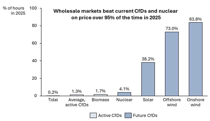 % of 2025 when short-term wholesale prices (MIP) were higher than CfDs: just 4.1% for the future nuclear CfD and 1.3% for active CfDs