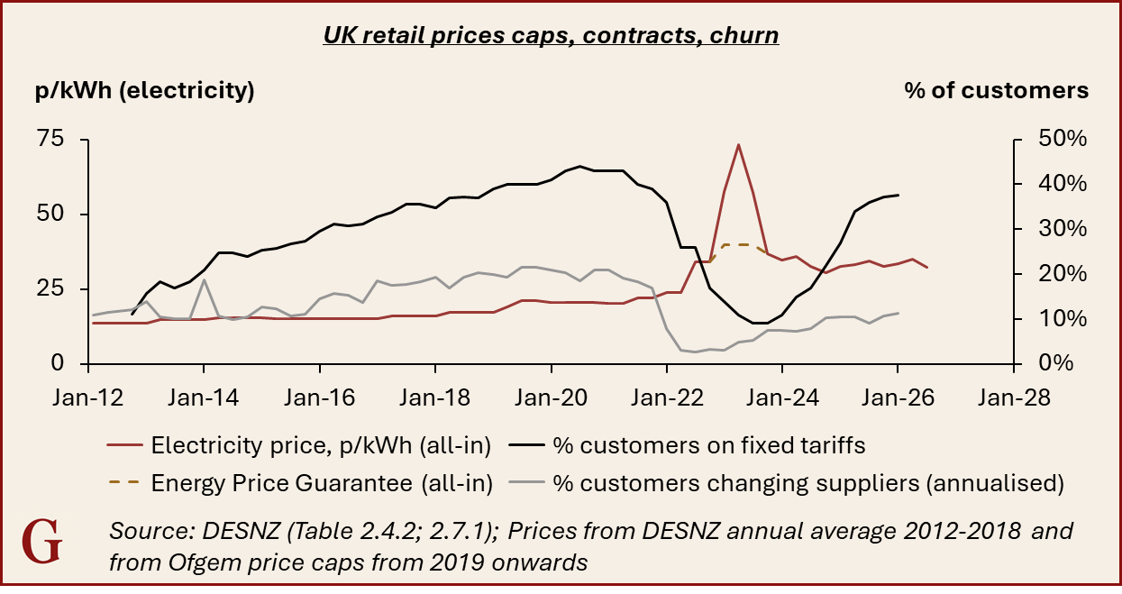 This price cap could be contributing to instability in energy prices. It uses prices that are up to 4.5 months out of date by the time they come into effect [viii]. Under this methodology, the price cap from July to September 2026 will be based on prices observed from February to May. The cap also assumes prices will be smoothed over the following 12 months. Meanwhile, the ~60% of customers who have the default tariff can switch at any time without a penalty [ix]. One in ten households switched suppliers in 2025.
